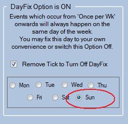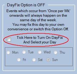 All Events which occur from 'Every 7' days onwards will -obviously- always occur on the same day each week. The Dayfix Option exists to permit 'You' to choose this day and so 'Fix' Events from 'Once per week on' to occur on a day that is convenient to you.