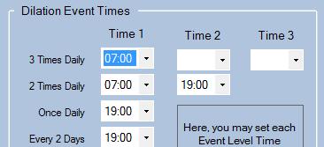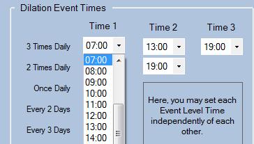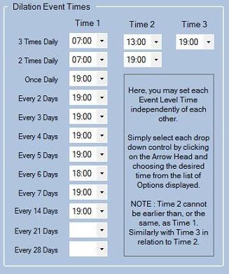 Lines 3 to 10 (1 x daily upto 1 x 14days) all have a drop down that lets you enter any time from Midnight (00:00) to 11pm. Should you want to, you can mix it up a bit, perhaps choosing to dilate in the morning for some levels and in the evening for others (but as yet, You cannot have multiple times on the same level).